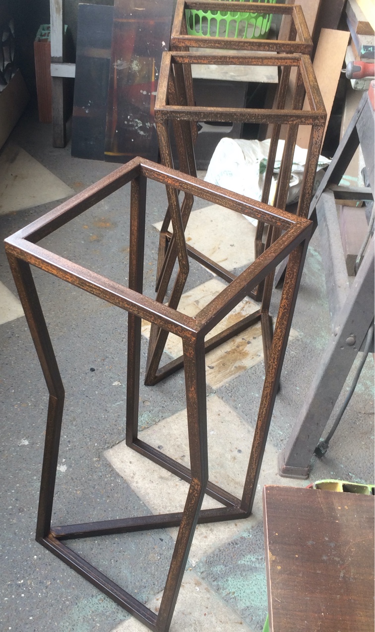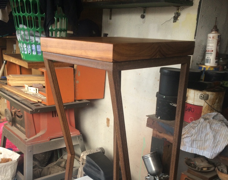 Elaborada con retal de madera sapán recuperada, unión de dos piezas pintadas con laca y base de acero con terminado rustico.