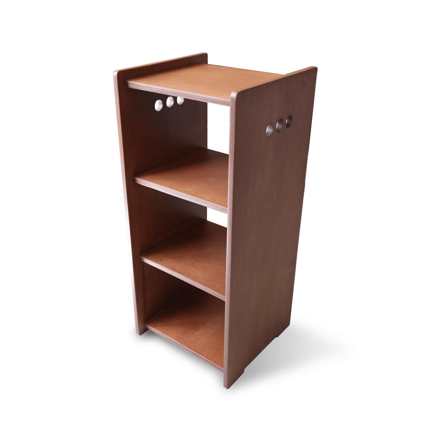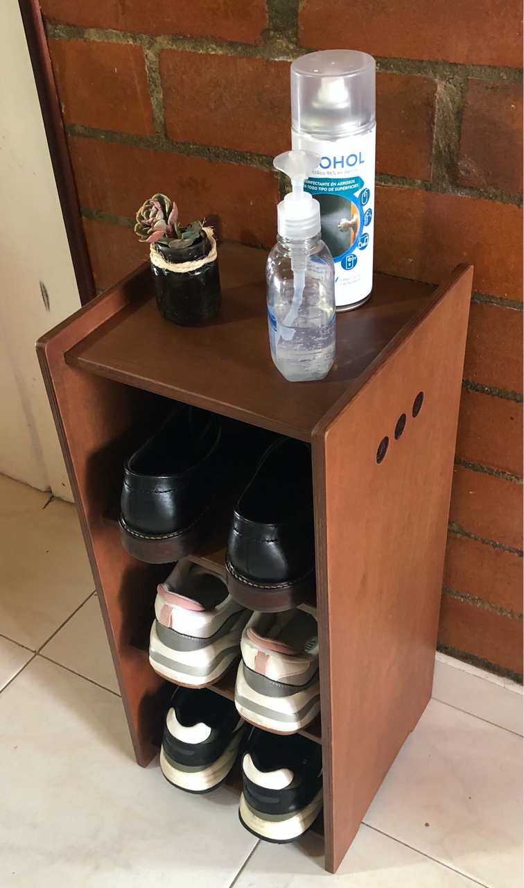 Elaborado en madera contrachapada, cuenta con tres secciones para zapatos y una tapa superior para accesorios.