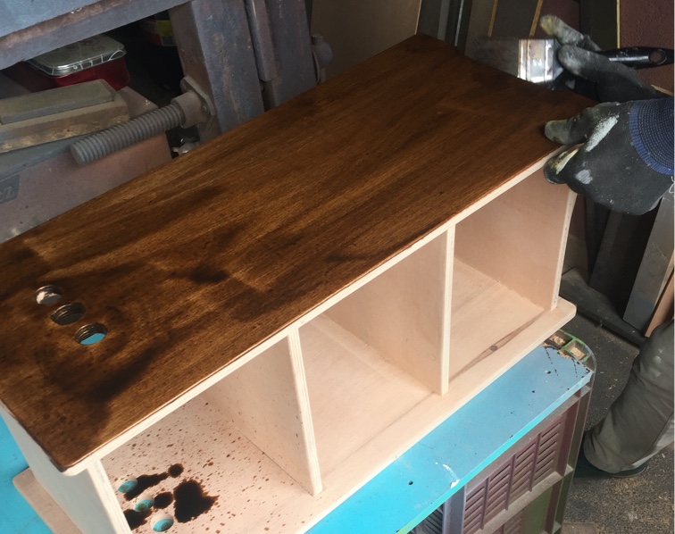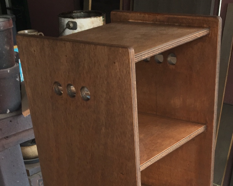 Elaborado en madera contrachapada, cuenta con tres secciones para zapatos y una tapa superior para accesorios.
