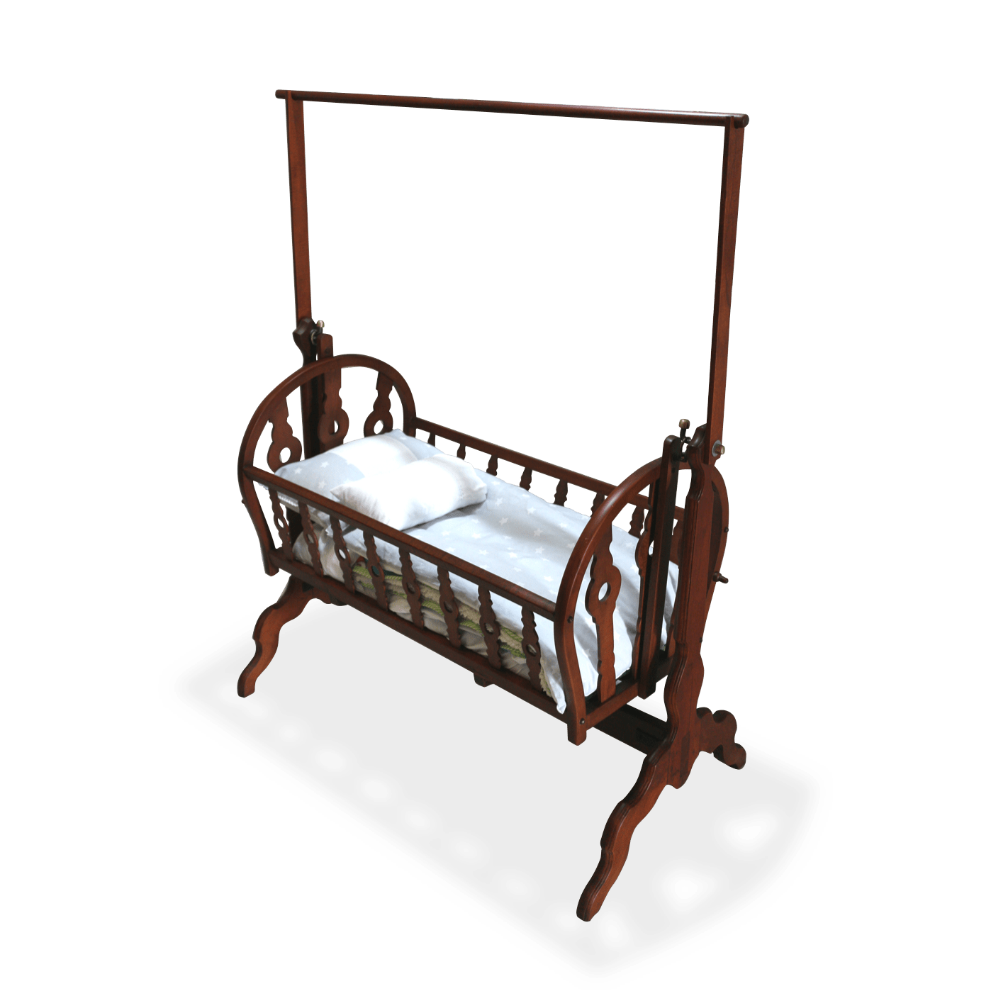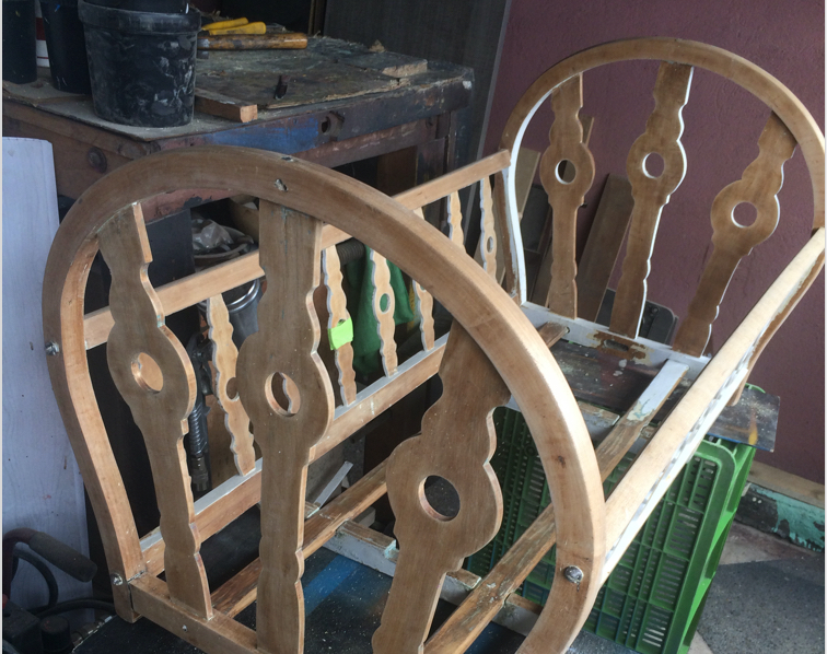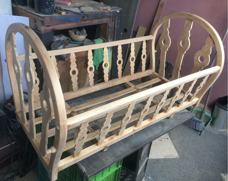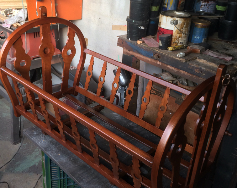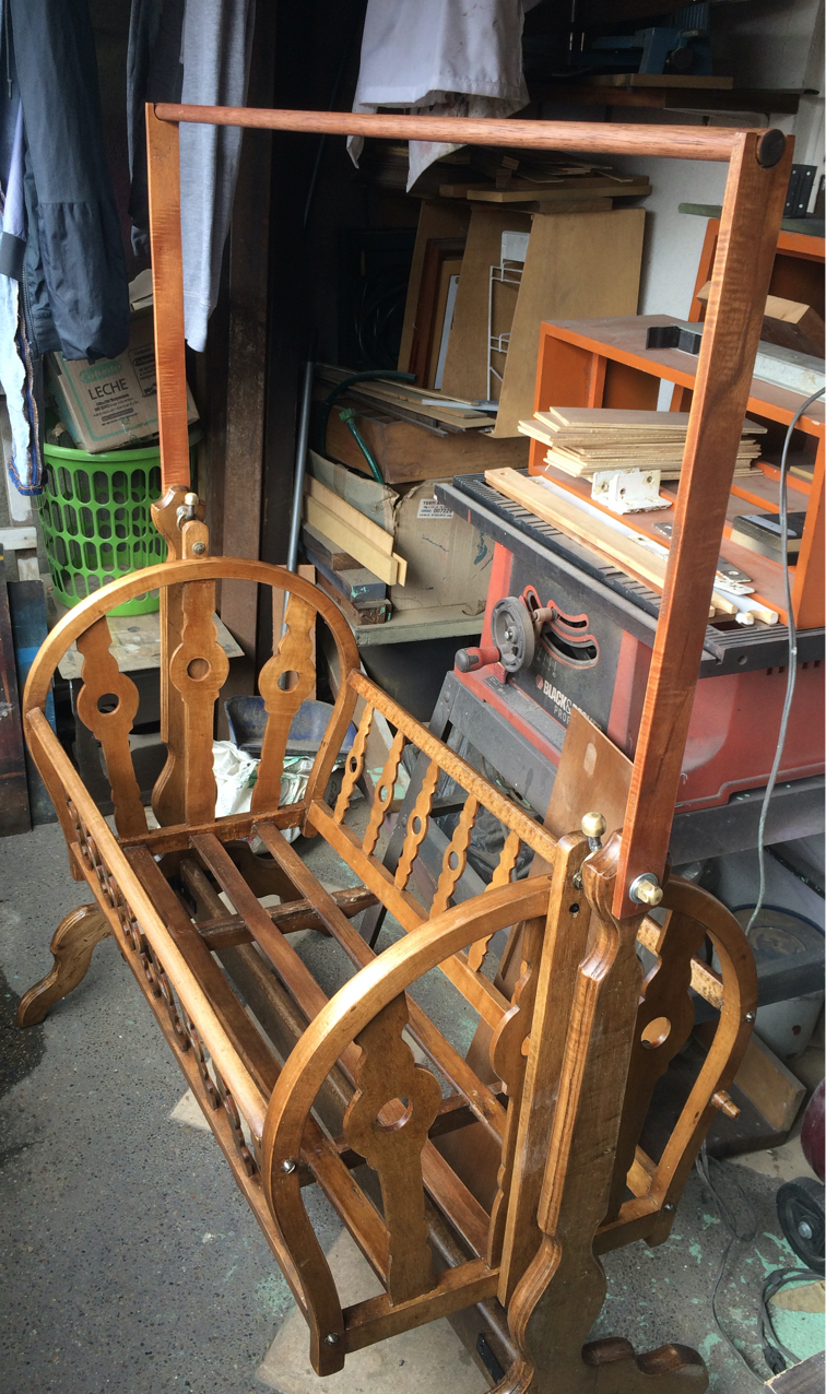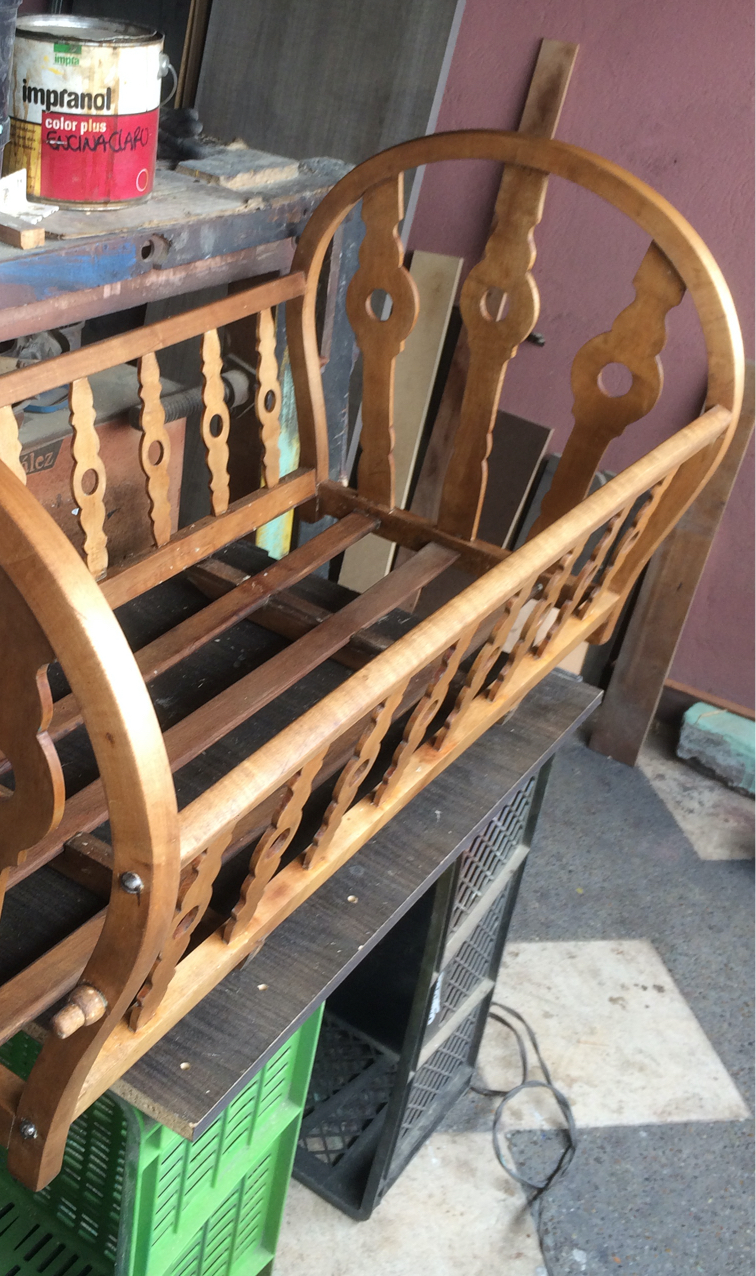 Renovación de moises con más de 100 años. Trabajo realizado pieza por pieza, remoción de 4 capas de pintura para volver al estado natural de la madera y pintado en sellador y laca, ajuste y fortalecimiento de base y soportes.
